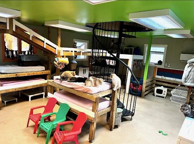 One side of the shelter is home to cats with life-limiting, contagious illnesses, including FIV and FeLV. This space is called the Dome, named for the gentle curve of its dome-shaped structure. Cats here live freely in a dedicated, peaceful, cage-free environment designed specifically for their comfort and well-being.